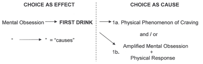 Based on our challenge of the reality of a physical phenomenon of craving we can now suggest that our problem comes from trying to reconcile a static model of who we are—Body, Mind, and Spirit—with a dynamic model of choice as both cause and effect. What happens if, instead of linking Body, Mind, and Spirit as the causal vehicle, we simply link the choice to drink or not drink as the causal vehicle. We take advantage of a definition of alcoholism that has choosing to take the first drink as the EFFECT of the mental obsession, but that choice then becomes the CAUSE of the physical phenomenon of craving (See above diagram). As soon as we say that a single choice is both cause and effect we also say that any human choice is both the result of past actions and the cause of future actions. We also get closer to the Holy Grail of addiction: an explanation that allows for the existence of individual choice and the existence of a runaway force that accumulates as a series of choices are linked together. We can postulate a proliferating momentum that, because it is stored in memory, outlasts the initial effects of those choices.