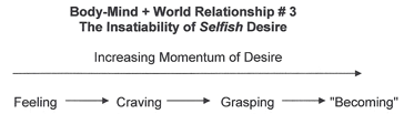 Whether starving in the scarcity of poverty or suffocating in the abundance of wealth, mankind remains afflicted with a preternatural desire for more than he has. We are always in a state of longing, whether for a better high, more knowledge, or a bigger and better God. Although the word “desire” evokes a spectrum of images ranging from clinical to romantic, here we have identified desire with three formative processes of the Self—Feeling, Craving, and Grasping—that create and propagate a proliferating Psycho-Physical Momentum that distorts our ability to choose. As we travel along our three interdependent links we move from “freer to choose” to “less free to choose”: at the moment of Feeling the volitional landscape is open and spacious; at the moment of Grasping it is closed and cramped.