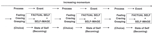 And addiction, as an acute example of how “something goes wrong with the remaking,” shows us how the State of Self is “continuously and consistently reconstructed.” Each Creative Event signals only one of a series of discontinuous “States of Self”—Factual Selves and their attendant Self-Images—recorded by Factual and Volitional Memory and propelled forward by the Momentum of Choice. Feeling, Craving, and Grasping are the Process by which these Events happen. We can now see how the very act of Body-Mind observing the World in which it lives triggers an irreversible cascade of self-centered desire: