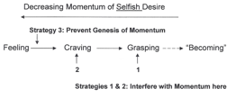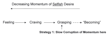 We have already proposed one Strategy for mitigating the Momentum of Choice at the end of the Feeling → Craving → Grasping chain of causation: bringing our vision of who we think we are in line with our vision of who we actually are—our Factual Self & Self-Image. But the desire to resolve Factual Self & Self-Image would simply create another round of Feeling → Craving → Grasping and its attendant pair of Factual Self & Self-Image. We must use more indirect means.